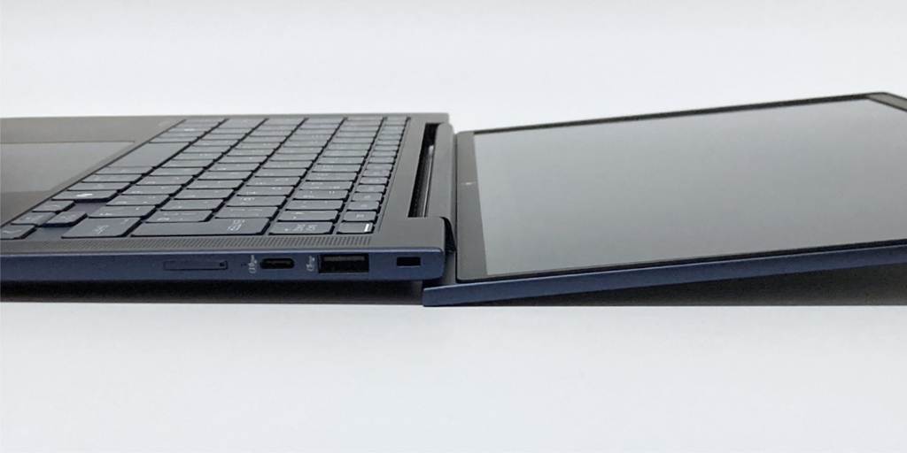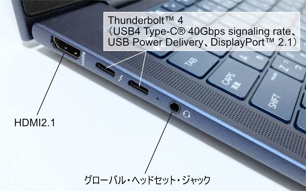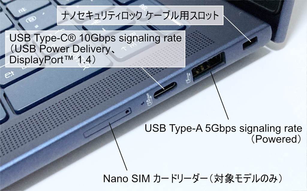 | インターフェイス | 【左側】 ・HDMI 2.1×1 ・Thunderbolt™ 4(USB4 Type-C®40Gbps signaling rate、 USB Power Delivery、DisplayPort™ 2.1)×2 ・3.5mm オーディオ / マイクジャックコンボ 【右側】 ・USB Type-C® 10Gbps signaling rate(USB Power Delivery、DisplayPort™ 1.4) ・USB Type-A 5Gbps signaling rate (Powered) ・Nano SIM カードリーダー(対象モデルのみ)←レビュー機 |