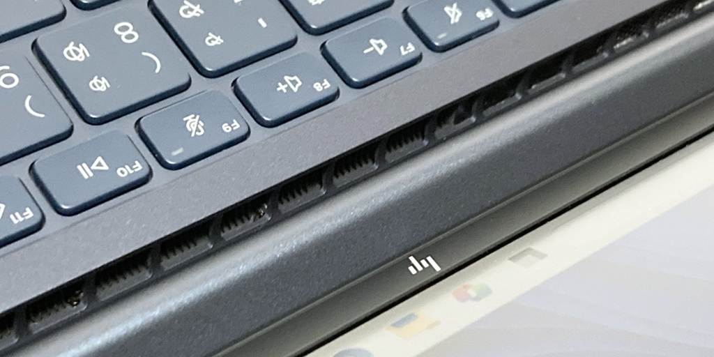キーボード両サイドのスピーカーに加え、底面前面の左右にもスピーカーを配置。音はノートPCとしては悪くないです。