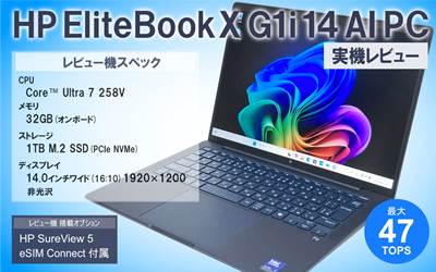 HP EliteBook X G1i 14 AI PCは、約1.19kgの薄型・軽量ボディに、Copilot+ PC準拠の高性能AI処理能力と法人向けの強固なセキュリティを兼ね備えた、完成度の高いビジネスノートPCです。