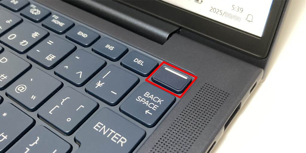 キーボード右上角には、指紋認証センサーを兼ねたpowerキーが配置されています。キー上部にはLEDが組み込まれていて、稼働中は点灯します。