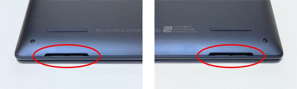 底面手前の左右にスピーカー、ゴム足を配置。奥側には通気口、およびゴム足を配置。メモリーはオンボードで交換がないため、底面には開口部なし。