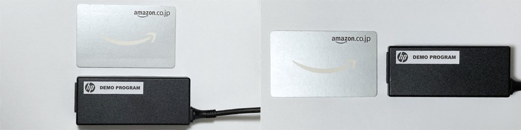 電源アダプターの電力出力が控えめな分、サイズもコンパクトです。画像は、クレジットカードサイズと比較したもの。