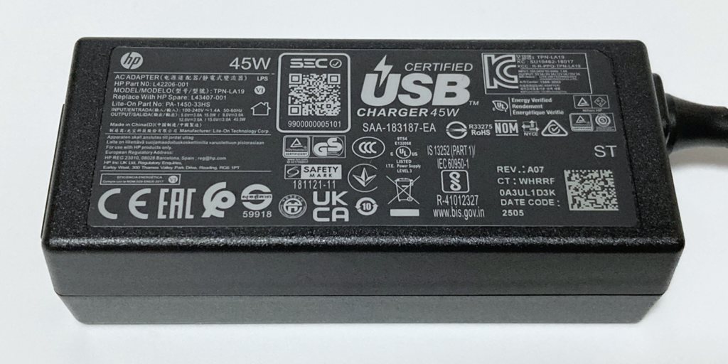 付属電源アダプターの電力出力は45W。オプションで65Wの電源アダプターも販売されており、購入カスタム時には、プラス3696円(※30%off)の少額でHP 65W USB-C ラップトップチャージャー v2に変更可能です。