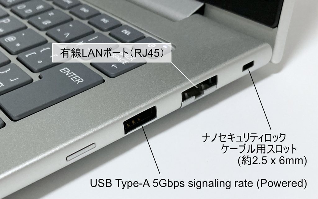 右側奥にはセキュリティロックケーブル用のスロットがあり、手前には有線LANポート、USB Type-A が配置されています。