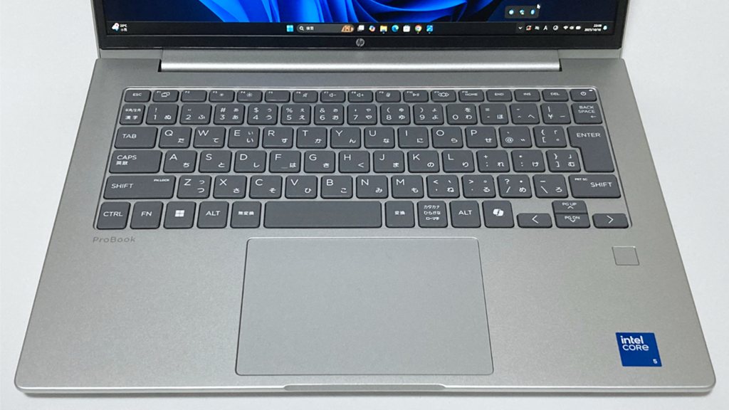 キーボード部分の両サイドには約2cmほど、スペース的に余裕が感じられます。下部のパームレストには中央に大きめのタッチパッド。その右側には、指紋認証センサーが配置され、intel Core 5のステッカーも貼られています。